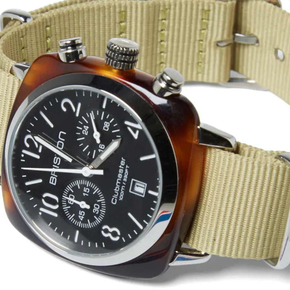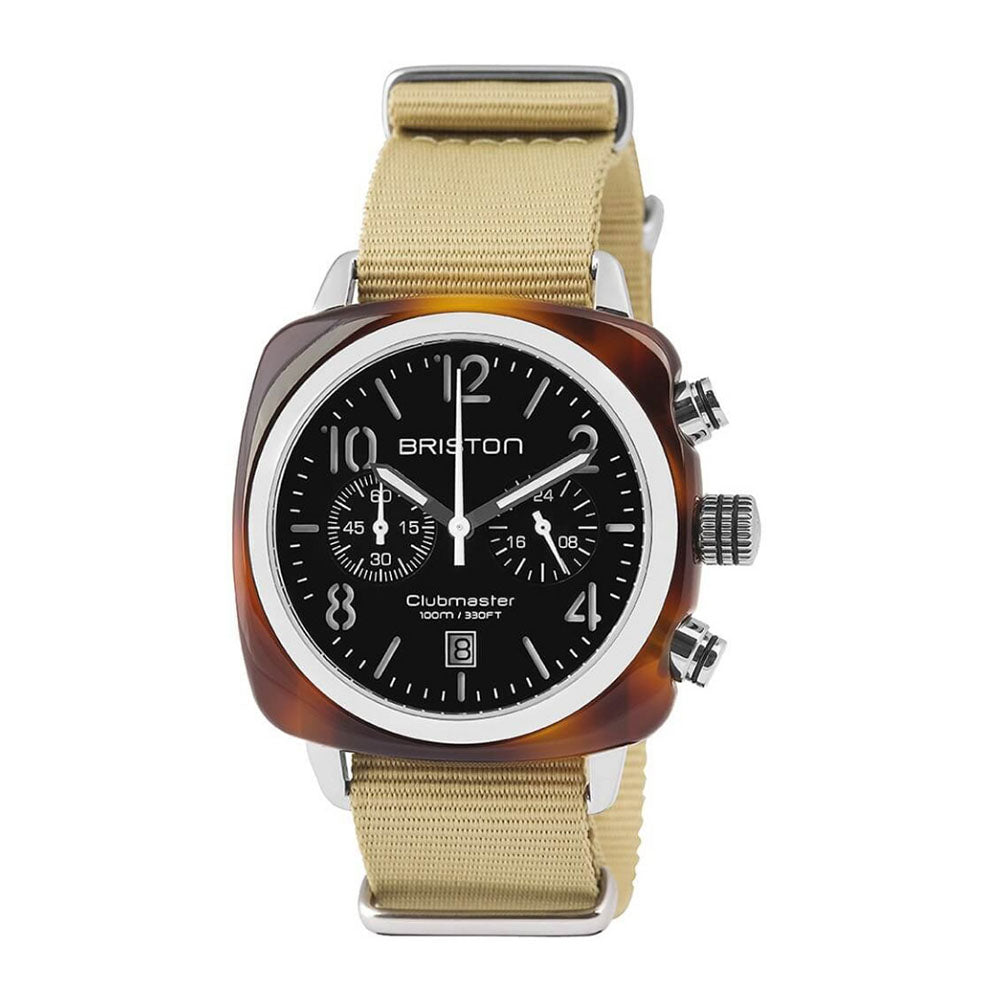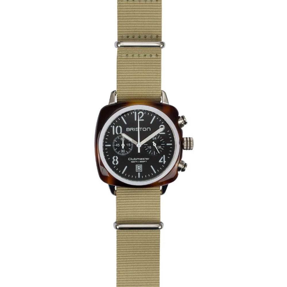 Clubmaster Classic chronograph watch, 40 mm. Stainless polished steel case and tortoiseshell acetate. Black dial. Chronograph, date, 2 counters. 60-minute counter at 9 o'clock, 24-hour counter at 3 o'clock. Hands with white Superluminova® luminescent inserts. Cambered mineral glass. Exclusive Briston interchangeable strap: khaki with steel buckles. Miyota OS21 quartz calibre.