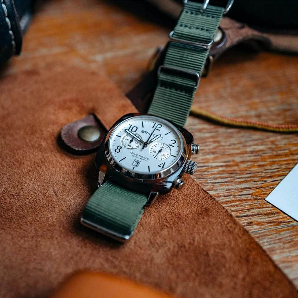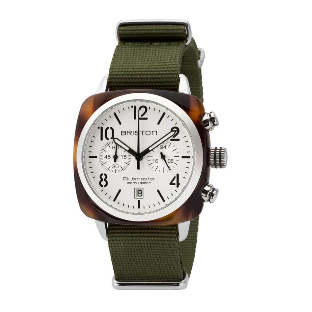 Clubmaster Classic chronograph watch, 40 mm. Case in polished steel and tortoiseshell acetate. Silvered white dial. Chronograph, date, 2 counters. 60-minute counter at 9 o'clock, 24-hour counter at 3 o'clock. Hands with white Superluminova® luminescent inserts. Domed mineral crystal. Exclusive Briston interchangeable strap: military green with polished steel buckles. Miyota OS21 quartz calibre.