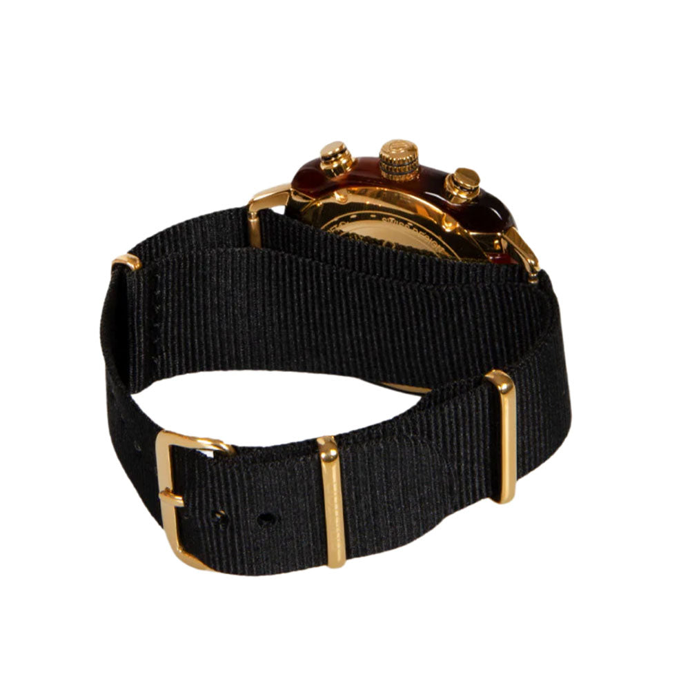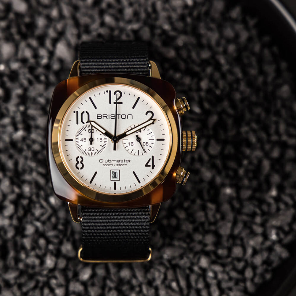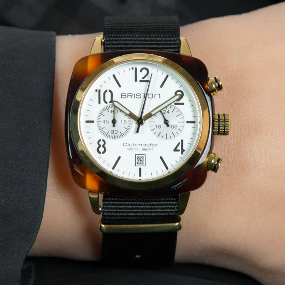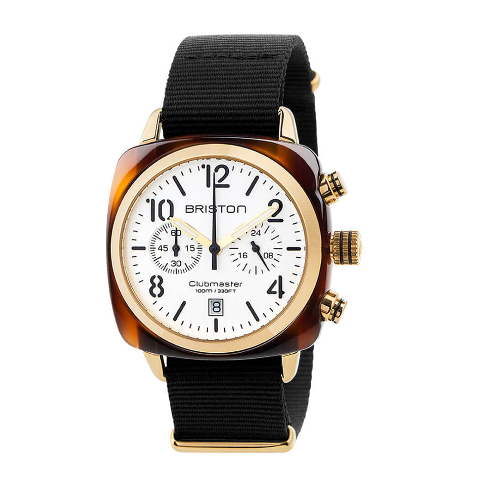 Clubmaster Classic chronograph watch, 40 mm. Steel case finished in yellow gold and tortoiseshell acetate. Silvered white dial. Chronograph, date, 2 counters. 60-minute counter at 9 o'clock, 24-hour counter at 3 o'clock. Hands with white Superluminova® luminescent inserts. Domed mineral crystal. Exclusive Briston interchangeable strap: black with yellow gold steel buckles. Miyota OS21 quartz calibre.