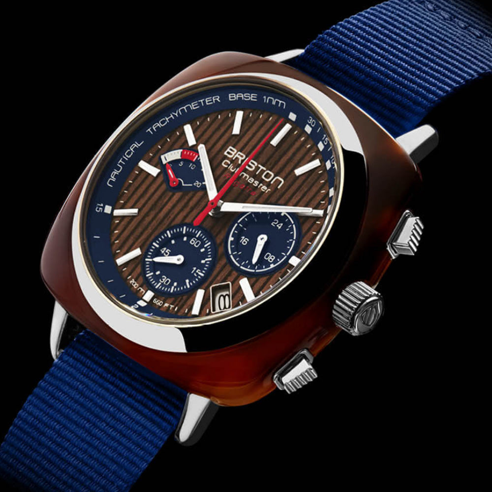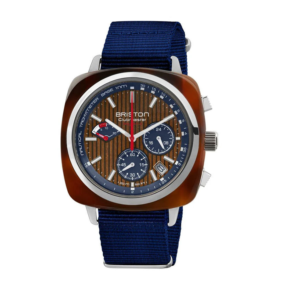 Clubmaster Regatta chronograph watch, 42 mm. Stainless steel and tortoiseshell acetate case. Genuine walnut dial. Chronograph, regatta counter with 5'+5' countdown, 24-hour counter at 3 o'clock and small seconds counter at 6 o'clock. Inner ring with nautical tachymeter scale. Hands and indexes with white Superluminova® luminescent inserts. Curved ultra-resistant K1 glass. Water-resistant to 200m / 20 ATM. Exclusive Briston NATO strap in navy blue nylon. Interchangeable without tools. Hybrid mechaquartz movement calibre VK83.