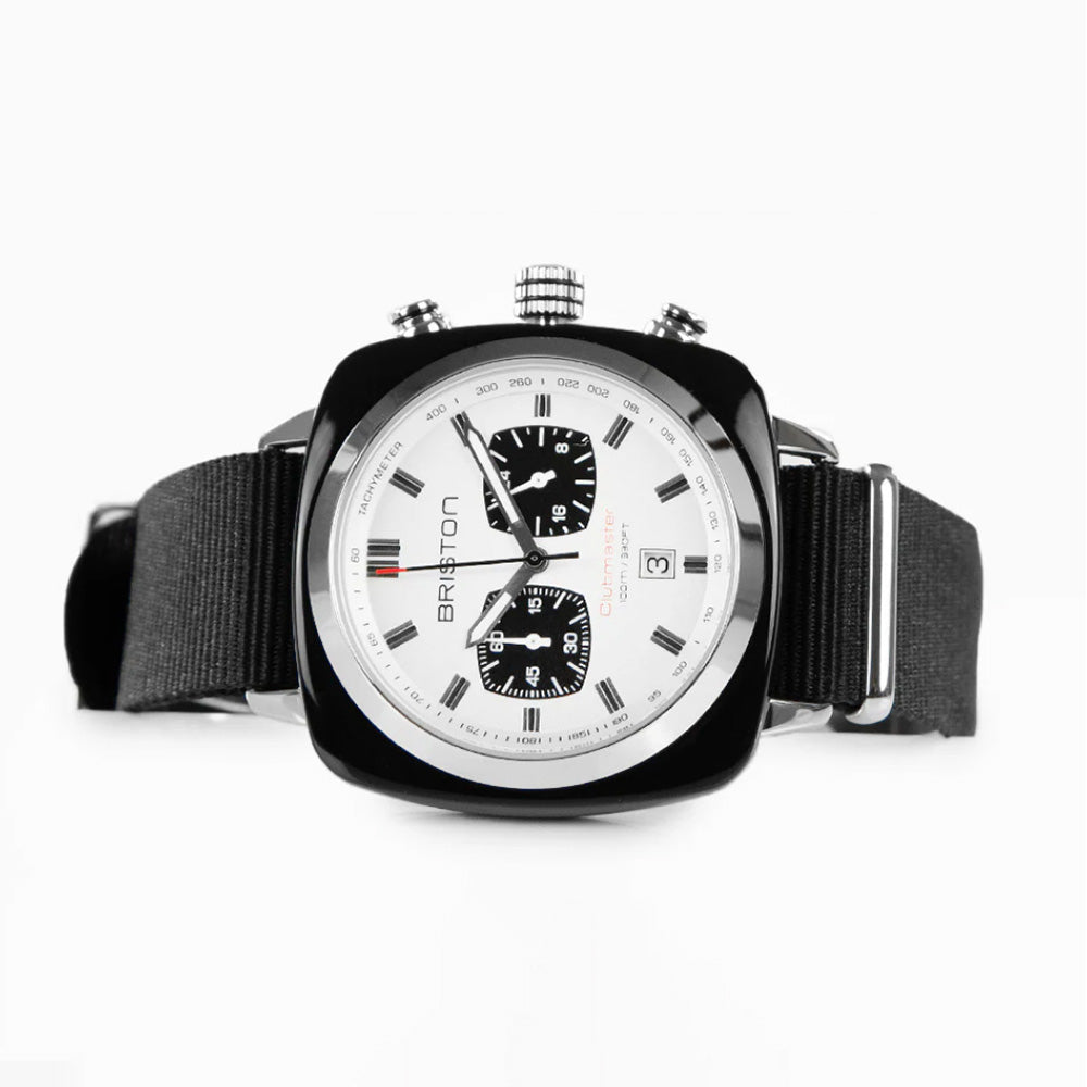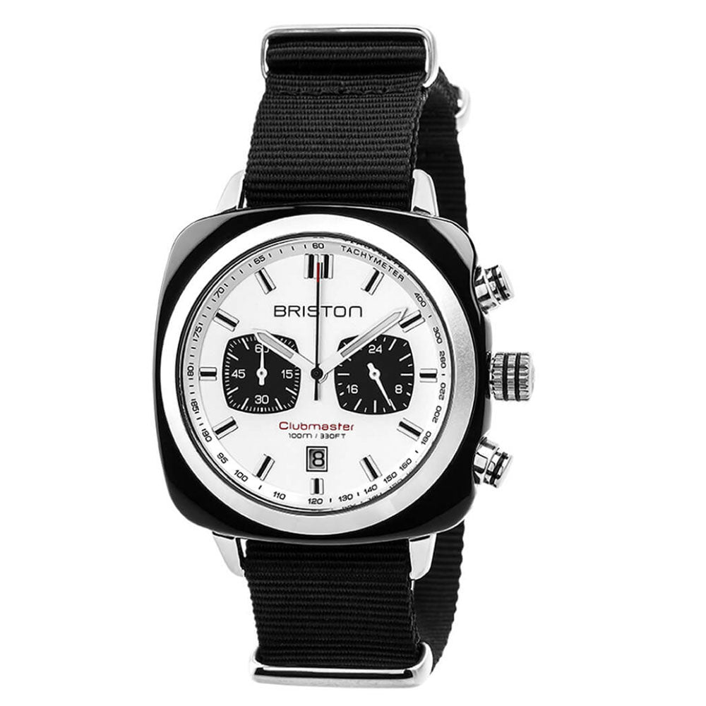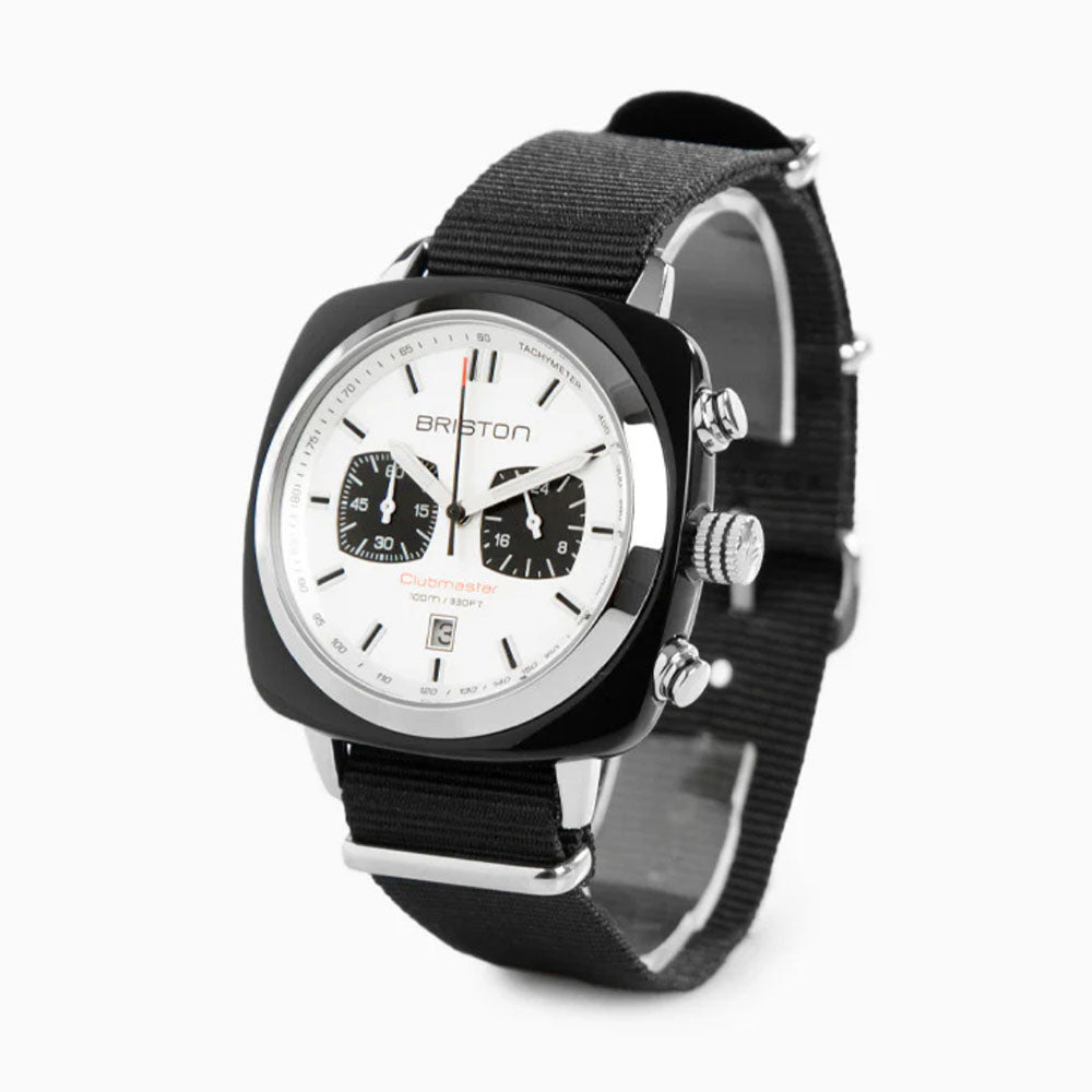 Clubmaster Sport chronograph watch, 42 mm. Steel and black acetate case. White dial. Chronograph, date, 2 counters. 60-minute counter at 9 o'clock, 24-hour counter at 3 o'clock. Hands with white Superluminova® luminescent inserts. Domed mineral crystal. Exclusive Briston interchangeable strap: black with polished steel buckles. Miyota OS21 quartz calibre.