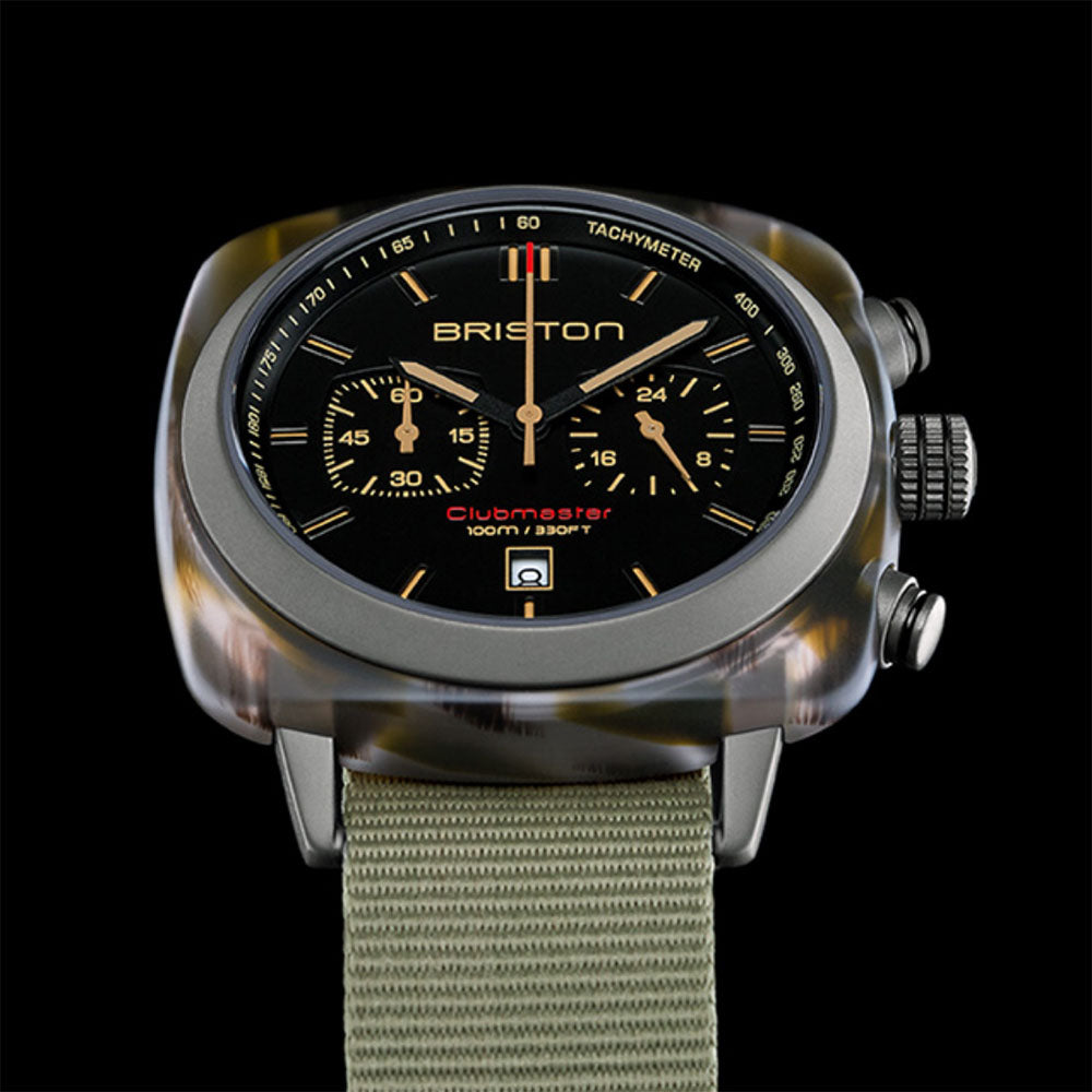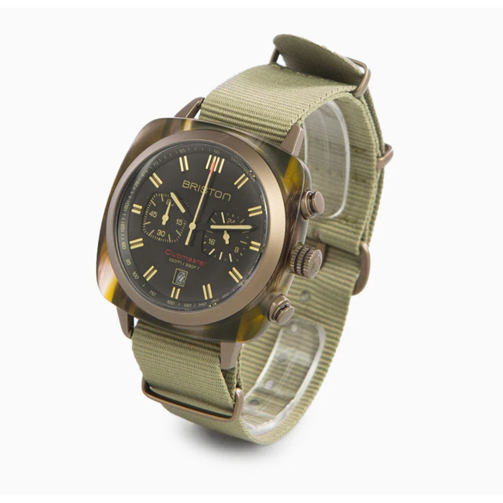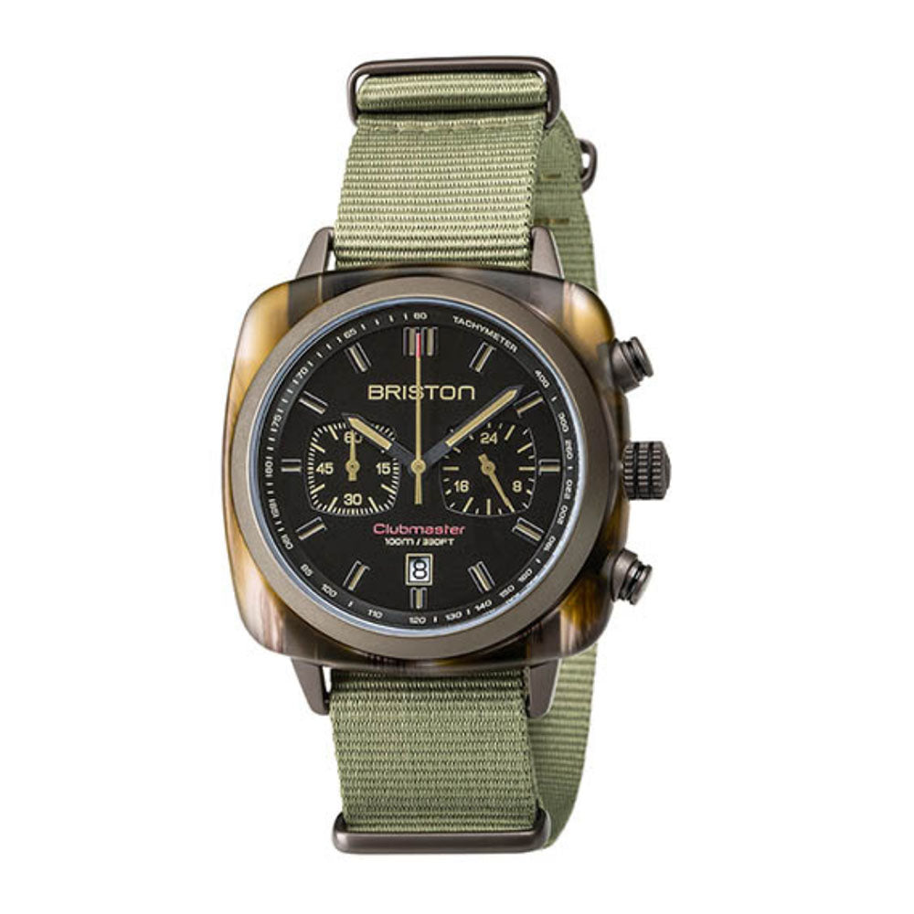 Clubmaster Sport chronograph watch, 42 mm. Steel case with khaki PVD finish and wood-effect green acetate. Matt black dial. Chronograph, date, 2 counters. 60-minute counter at 9 o'clock, 24-hour counter at 3 o'clock. Hands with light green inserts. Domed mineral crystal. Exclusive Briston interchangeable strap: green with khaki PVD steel buckles. Miyota OS21 quartz calibre.