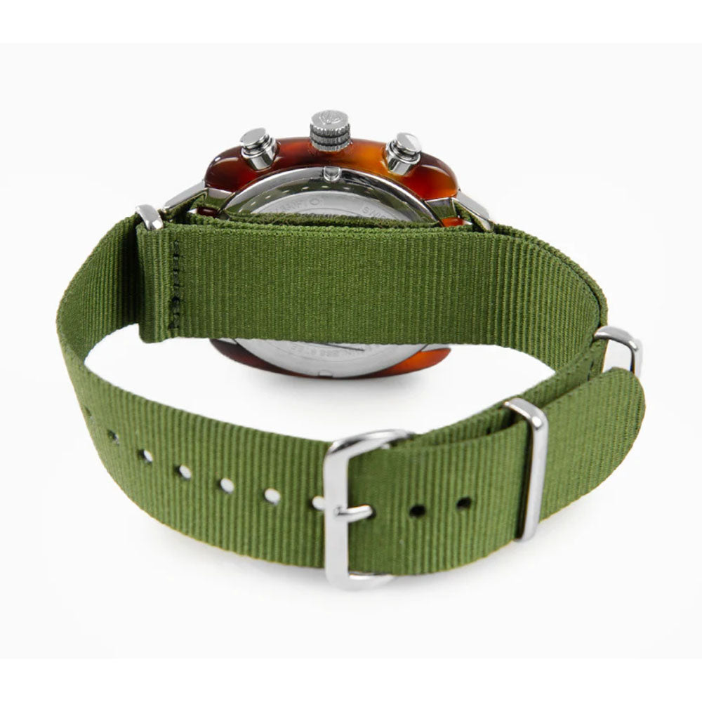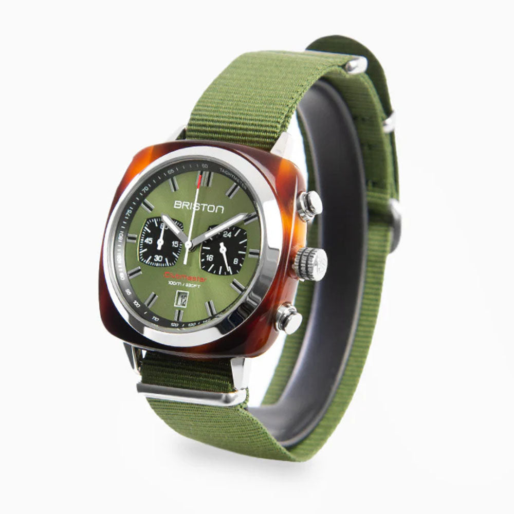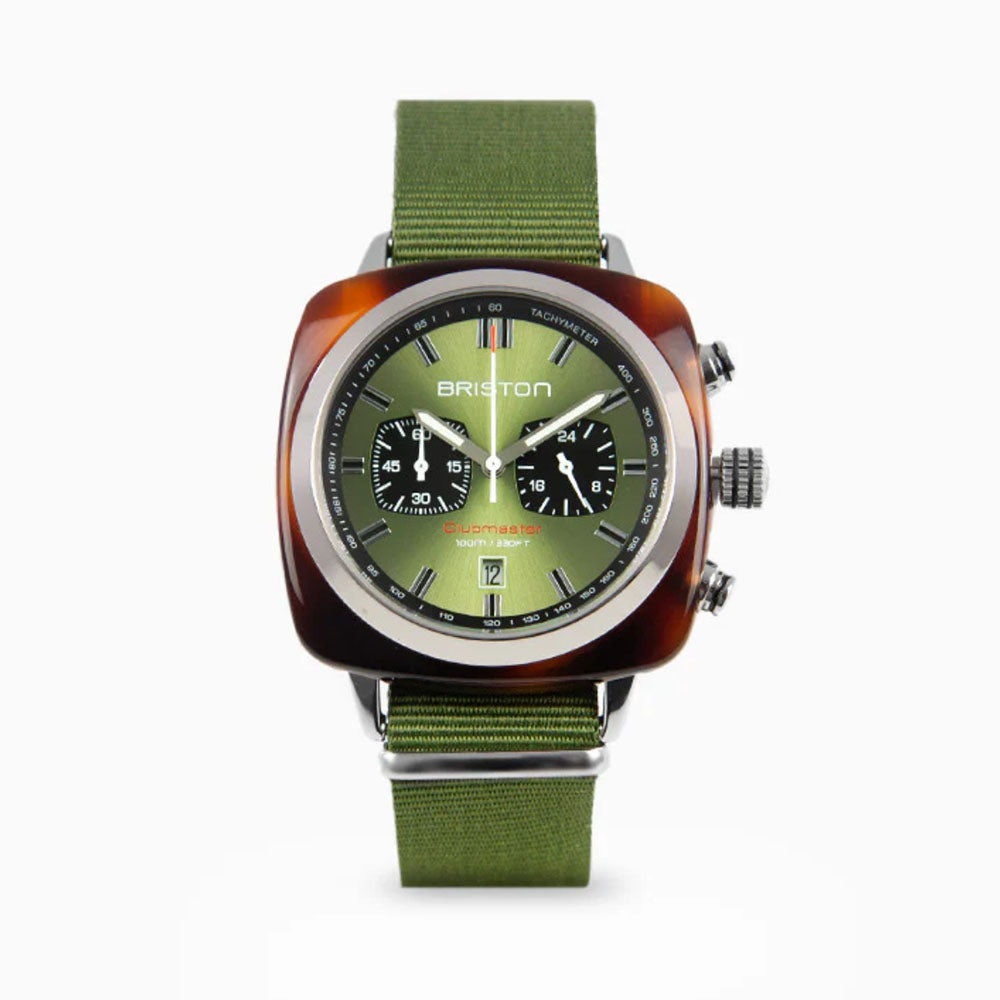 Clubmaster Sport chronograph watch, 42 mm. Steel and tortoiseshell acetate case. Olive green sunray dial. Chronograph, date, 2 counters. 60-minute counter at 9 o'clock, 24-hour counter at 3 o'clock. Hands with white Superluminova® luminescent inserts. Domed mineral crystal. Exclusive Briston interchangeable strap: olive green with polished steel buckles. Miyota OS21 quartz calibre.