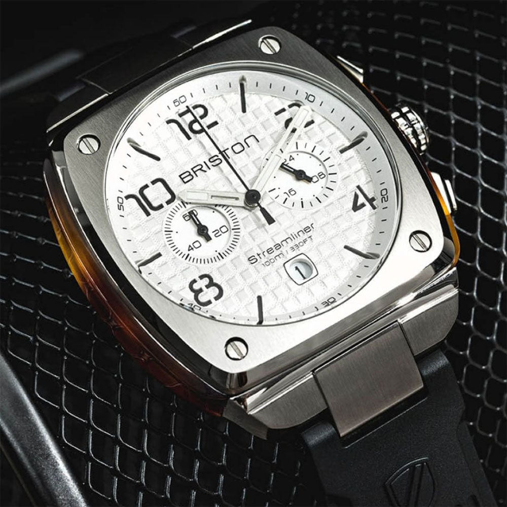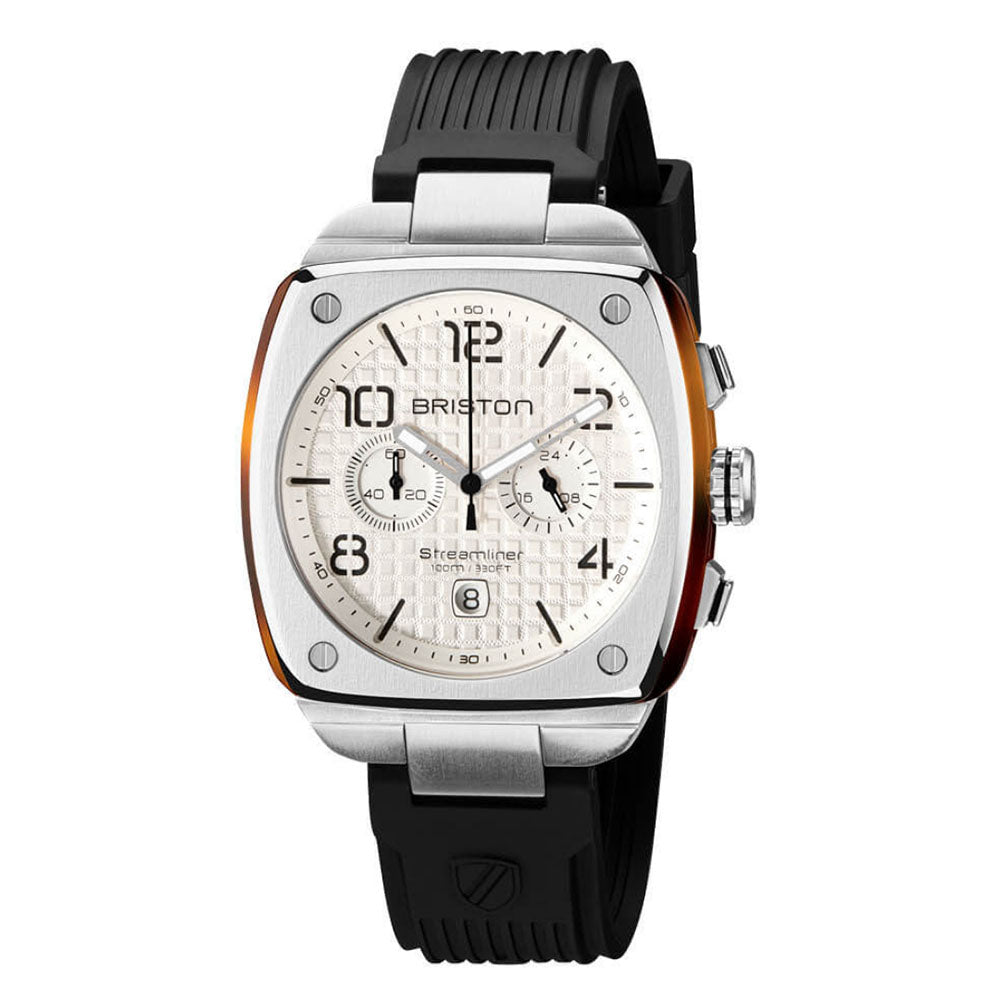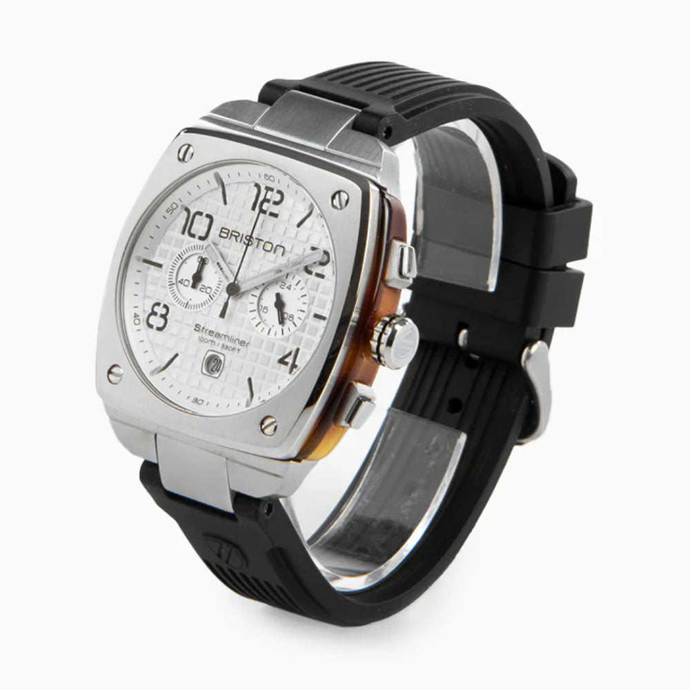 Streamliner Urban chronograph watch, 42 mm. Case in brushed steel and tortoiseshell acetate. White embossed dial. Chronograph, 2 counters and date window at 6 o'clock. 60-minute counter at 9 o'clock, 24-hour counter at 3 o'clock. Hands with luminescent inserts. K1 resistant mineral crystal - 2.80 mm thick. Exclusive Briston "soft touch" vulcanised rubber 2-piece bracelet: black with polished steel buckles. Miyota OS21 Japanese quartz calibre.