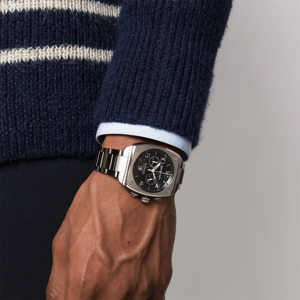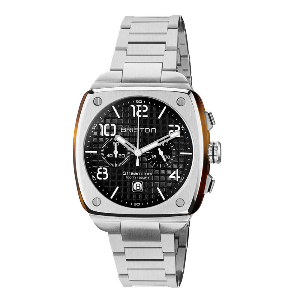 Streamliner Urban chronograph watch, 42 mm. Case in brushed steel and tortoiseshell acetate. Black embossed dial. Chronograph, 2 counters and date window at 6 o'clock. 60-minute counter at 9 o'clock, 24-hour counter at 3 o'clock. Hands with luminescent inserts. K1 resistant mineral crystal - 2.80 mm thick. Exclusive Briston steel bracelet. Miyota OS21 Japanese quartz calibre.