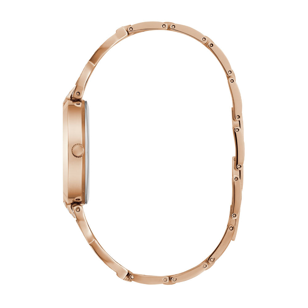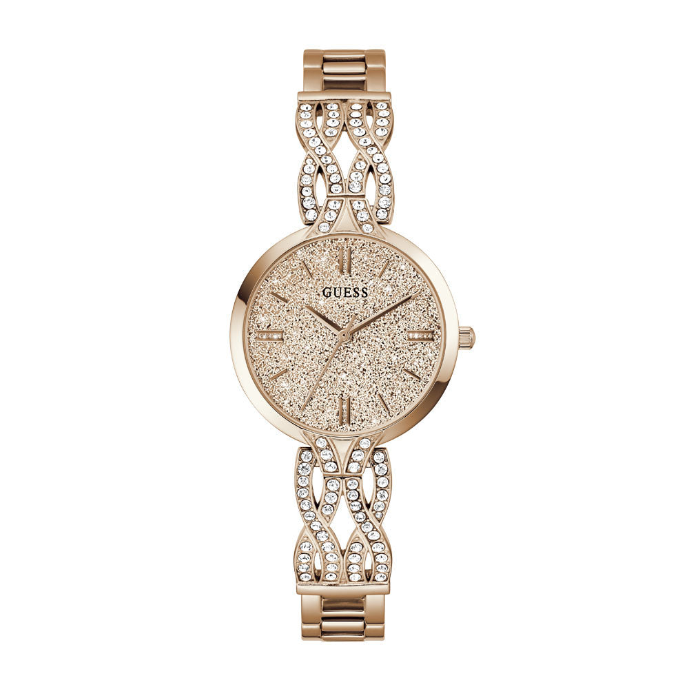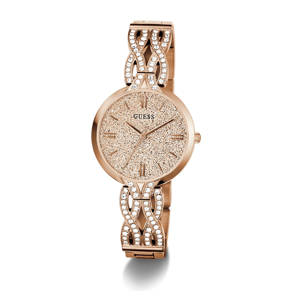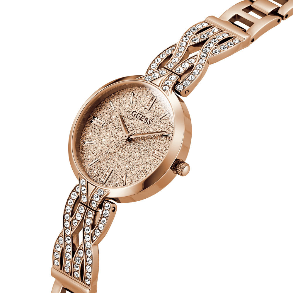 This underwater-inspired look features a full glitter dial with a crystal, coral-like patterned bracelets. Self-adjustable g-links make this piece easy to size.