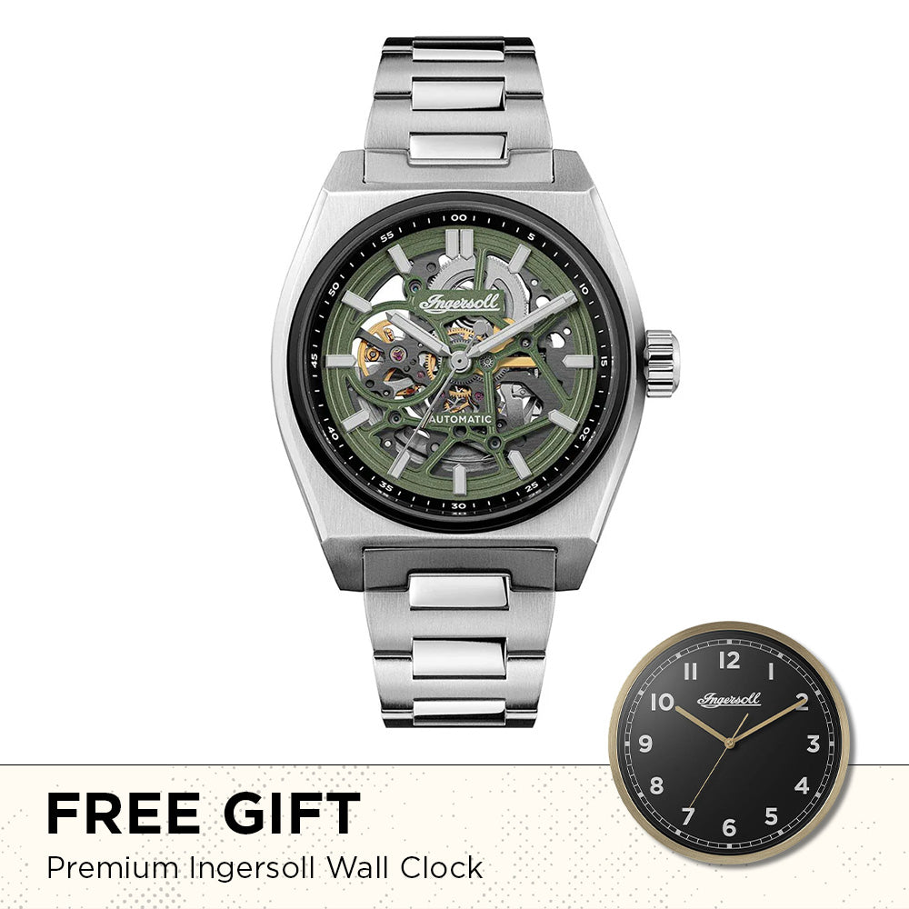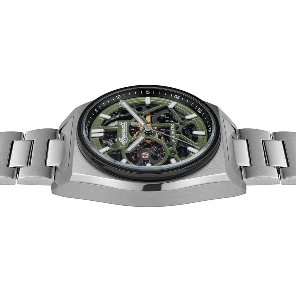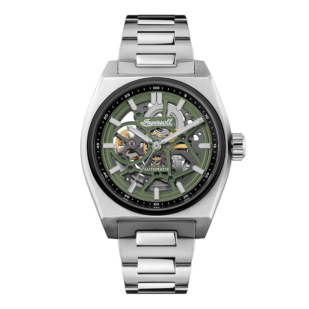 A new fusion of craftsmanship and contemporary design, the Ingersoll INI14304 is a statement of mechanical artistry. Encased in polished stainless steel, its open-heart skeleton dial in a unique olive green hue showcases the mesmerizing inner workings of its automatic movement, a testament to precision engineering. for those who appreciate both form and function, the INI14304 is more than just a watch—it's a conversation piece, a glimpse into the artistry of time itself.