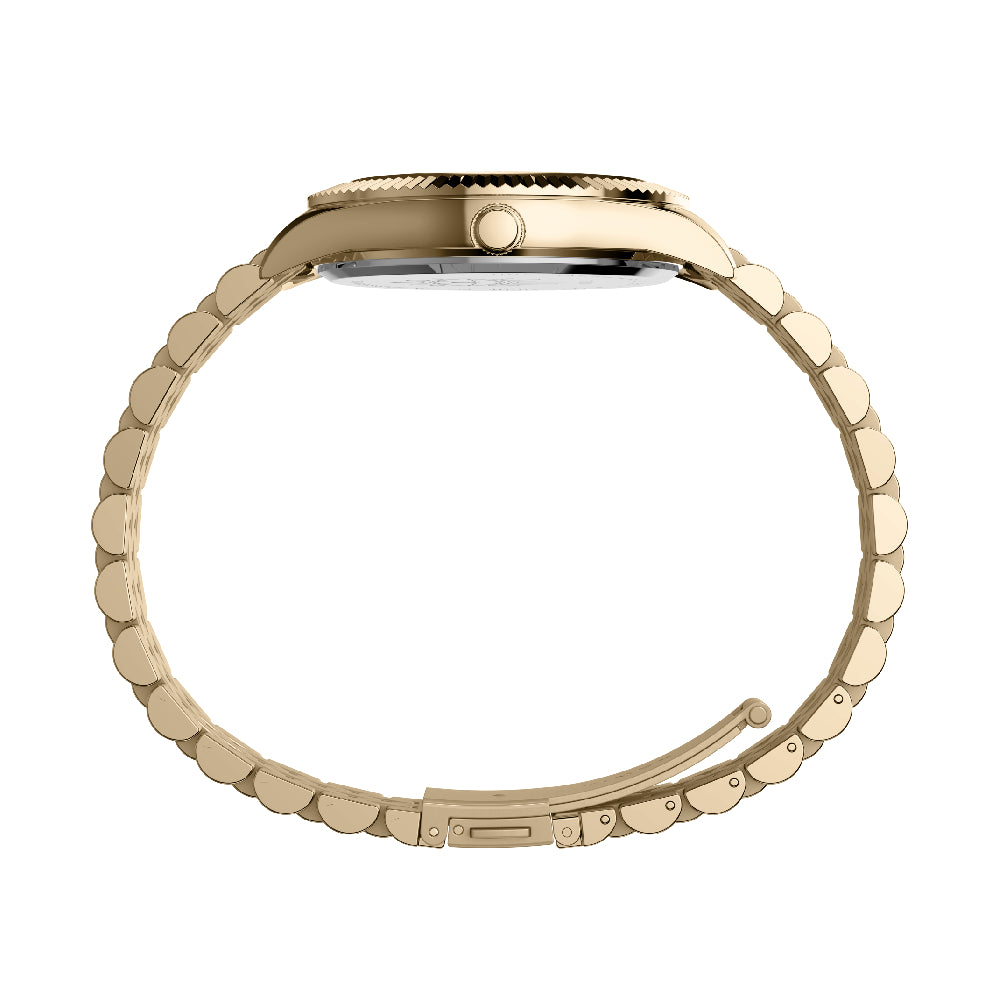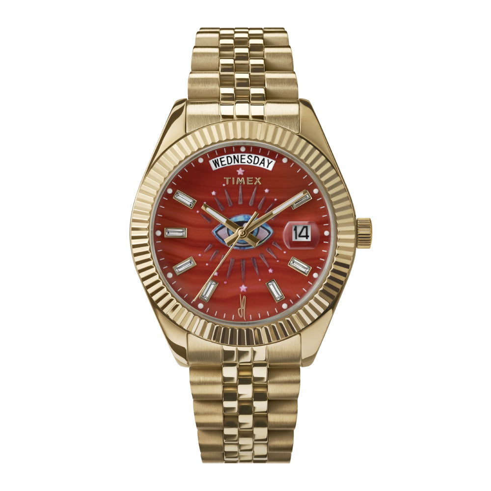 The Golden Eye collection blends timeless beauty with celestial charm. Jacquie’s signature starburst tribe eye appears in the center of the brilliant red agate dial, with the day of the week spelled out in full at 12 o’clock and a date window at 3 o’clock. Faceted Austrian crystal hour markers shimmer with your every movement, while a gold-tone stainless-steel case and bracelet keep your wrist stack shining. Transcend the ordinary and glimpse into a world of endless possibilities…The power of now is as good as gold.